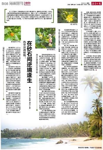 ■ 海南日报记者 张期望 通讯员 张哲在人们印象中,在高温高盐的近海沙滩和礁石处,通常是生命的禁区,只有仙人掌和野菠萝等耐热耐盐的植物勉强生长。事实上,除了上述两种植物外,还有不少耐高温高盐的植物在海南岛及其附近海域岛礁上顽强生长,比如橙花破布木、莲叶桐、海人树、水芫花等。它们在近海的一些高盐的沙地上、礁石缝隙之间生长,向人们展示着生命力的顽强。为了保护好这些植物,国家将它们列入重点植物保护名录。