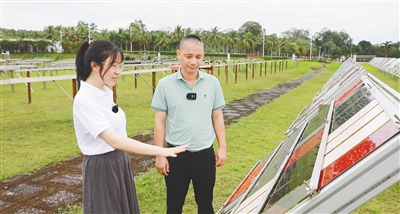 海南日报记者陈子仪(左)在暴晒场采访。海南日报记者 陈若龙 摄