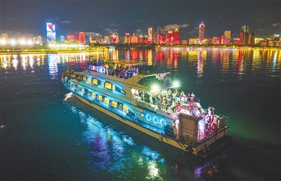 近日,航行在海口湾的“海南之星”号游船,带领游客领略璀璨的海口夜景。该游船从国家帆船基地公共码头出发,一路打卡秀英码头、万绿园、天空之山、世纪大桥、东坡老码头等海口标志性景观,极大丰富了市民游客夜览海口的体验。本报记者 李天平 摄