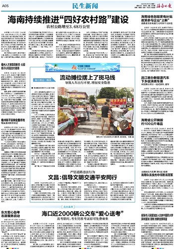 此外,交旅融合让“四好”农村路加速出圈。我省已建成988公里环岛旅游公路,年底466公里环热带雨林国家公园旅游公路将全面通车,构建起海南全域旅游新格局;打造文昌鸡、罗非鱼等一批特色农产品产业路,建设宋庆龄旧居公路、博鳌留客村侨乡路等一批文化路,持续推动农村公路与旅游、生态、文化等深度融合发展。