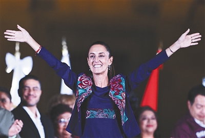 墨西哥执政党国家复兴运动党所在竞选联盟总统候选人克劳迪娅·辛鲍姆3日凌晨在首都墨西哥城宣布赢得总统选举胜利,将成为墨西哥史上首位女总统。图为克劳迪娅·辛鲍姆在墨西哥首都墨西哥城庆祝胜利。新华社/法新