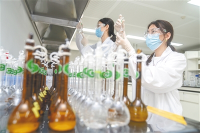 6月4日,在海南先声药业海口药谷生产基地里,技术人员正在开展实验。