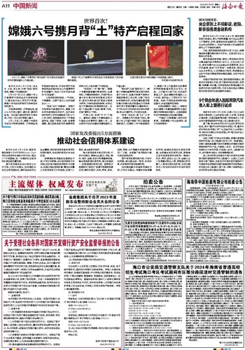 “取宝地”一次“看个够”。嫦娥六号着陆器配置的降落相机、全景相机、月壤结构探测仪、月球矿物光谱分析仪等多种有效载荷正常开机,服务月表形貌及矿物组分探测与研究、月球浅层结构探测、采样区地下月壤结构分析等探测任务。这些“火眼金睛”不但能“看清”月球,还能“看明白”月球。