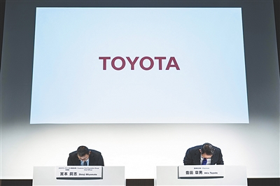 图为6月3日,丰田汽车公司会长(董事长)丰田章男(右)在东京召开的记者会上鞠躬道歉。