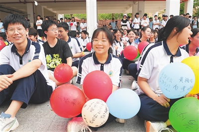 6月3日,五指山市海南热带海洋学院附属中学高中师生举行活动。高三的同学们脸上洋溢着喜悦和激动,他们在气球上写上祝福语,迎接高考的到来。通讯员 孟志军 摄
