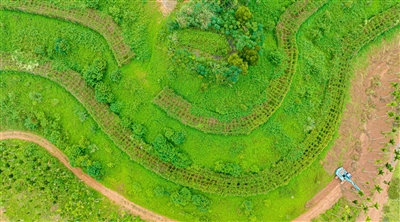 一处矿山,化灰为彩。定安县雷鸣镇,原金鸡岭农场十二队北矿段矿山修复现场,新栽的百香果绿油油一片,藤蔓间鸟儿啁啾声,诉说着青青发展之意。