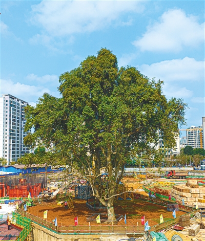 “全方位呵护”让古树自由生长。项目划出1100平方米保护区,在周边设置防护围挡,在树根的5米范围内不做硬化措施,为古树划出了安全距离。