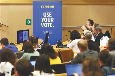 6月6日,在位于比利时布鲁塞尔的欧洲议会,媒体记者参加选举投票情况介绍会。 新华社发