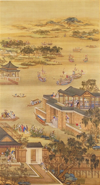 清代《雍正十二月行乐图》之《五月竞舟》(局部)。 北京故宫博物院藏
