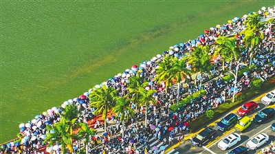 6月10日,在海口市海甸河钟楼附近,观看龙舟赛的市民游客。 本报记者 张茂 摄