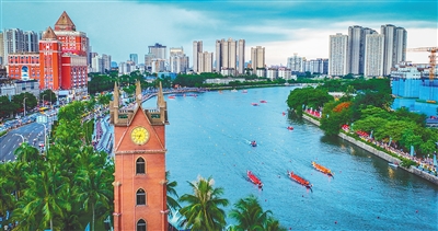 6月10日,2024“海口杯”端午龙舟邀请赛在海口市海甸河钟楼附近水域举行,图为参赛队伍在比赛中。本报记者 张茂 摄