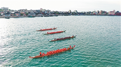 6月10日,琼海市博鳌镇的民众在万泉河入海口赛龙舟。特约记者 蒙钟德 摄