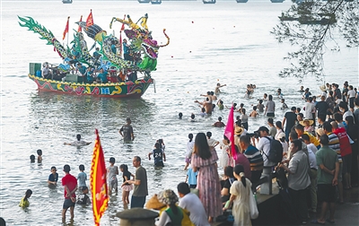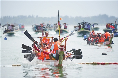 6月10日,在儋州市光村镇泊潮村,龙舟上的村民向岸边的观众送去祝福。本报记者 李天平 摄