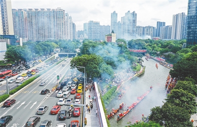 “龙船景”是广府地区水乡在端午期间举办的一种民俗活动。图为广州市猎德村热闹的传统龙舟“龙船景”与繁忙的现代都市交汇相融。