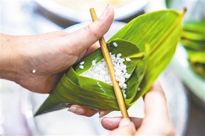 居民在贵州省安顺市西秀区蔡官镇北斗社区包粽子。