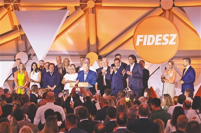 6月10日凌晨,匈牙利总理欧尔班(中)在匈牙利首都布达佩斯举行的集会上发表讲话。欧尔班领导的执政联盟(青民盟和基民党)以43.76%的得票率领先,预计将获得匈牙利在欧洲议会21个席位中的11席。新华社发