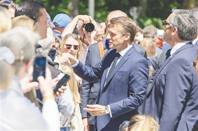 6月9日,在法国勒图凯市一处投票站外,法国总统马克龙(右二)在参加欧洲议会选举投票前与民众交流。新华社发