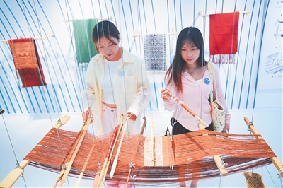在三亚南山文化旅游区,来自广东的游客参观黎族传统纺染织绣技艺展。本报记者 王程龙 摄