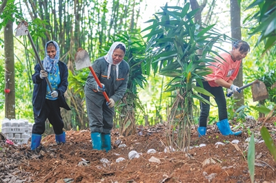 近日,在白沙黎族自治县青松乡益条村的橡胶林里,村民在忙着种植菌包。近年来,白沙青松乡依托优良的自然生态环境,大力发展林下经济,推广“胶+菇”复合生态种养模式。红托竹荪、赤灵芝、虎奶菇、虎乳灵芝等菌菇在橡胶林下长势良好,菌菇产业种植总面积超过7700亩。