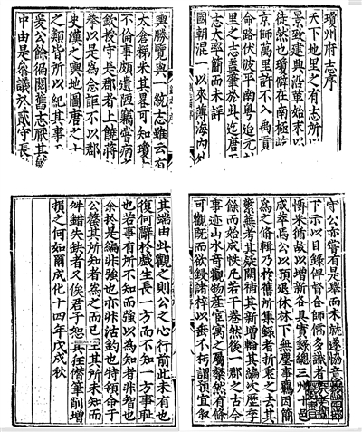 “……事颇遗陋,窃常病之。□钦授守是郡者,上饶蒋□□拳以是为念,讵不以郡□史,汉之舆地图,唐之□之类,皆所以记其事□爰。公余遍阅旧志,厌其繁□中。由是参议于贰守长,□守公亦尝有是举而未就,遂协意檄诸部下,示以目录,俾督合师儒多识者,旁搜而博采,循故以增新,各具实录,总三州十邑咸萃焉。