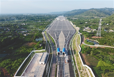天府动车所位于四川天府新区太平街道,由中铁十九局、中国铁建电气化局集团承建,规划总面积约2090亩,是西南地区最大的动车所,有检修线12条,可同时检修24组标准动车组,最大可担当每天90组标准动车组的检修任务。