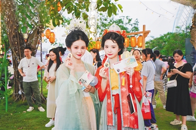 市民游客在2024年海南岛欢乐节开幕式现场参与东坡国风游园会活动。