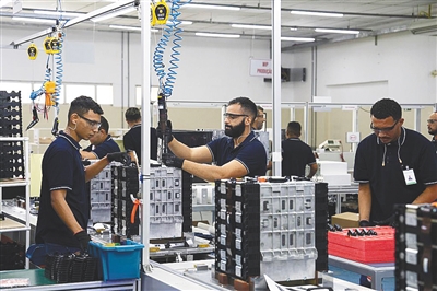 工作人员在位于巴西亚马孙州马瑙斯的比亚迪电池工厂生产线上工作。 新华社发