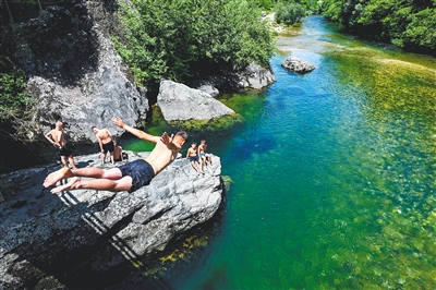 在北马其顿首都斯科普里附近,一名男子跳入河中消暑。 新华社发