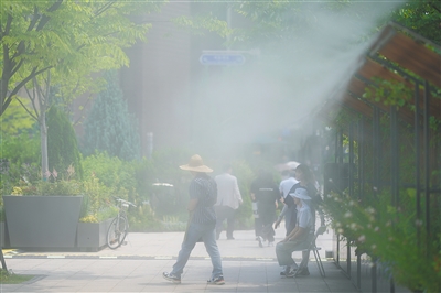 人们在韩国首尔一处水雾设施下纳凉。新华社发