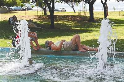 人们在希腊塞萨洛尼基一处喷泉旁纳凉。 新华社发