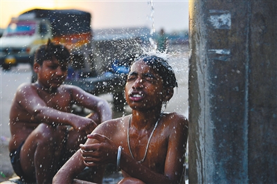 孩子们在印度贾朗达尔街边冲凉。 新华社发