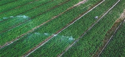 海口市美兰区三江镇的一处农田,种植户给豆苗浇水。海南日报记者 袁琛 摄