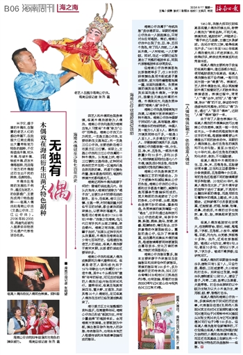 ■ 海南日报记者 张期望兴于汉,盛于唐的木偶戏,在智慧的老艺人们的推动传播下,在我国大江南北涌现出大量带有地方特色的剧种,不仅有提线木偶、杖头木偶、布袋木偶、铁枝木偶、药发木偶等剧种,而且每个地方的木偶剧还衍生出不同的种类,各具特色。