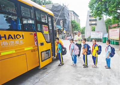 6月19日,五指山市水满中心学校放学后,一、二年级的学生排队乘坐校车回家。据了解,为解决乡村教学点撤并后低年级学生乘车难的问题,五指山市今年在各乡镇中心学校共投入了7辆校车,为400余名一、二年级学生提供免费接送服务,偏远地区的学生求学路有了校车护航。本报记者 李天平 摄