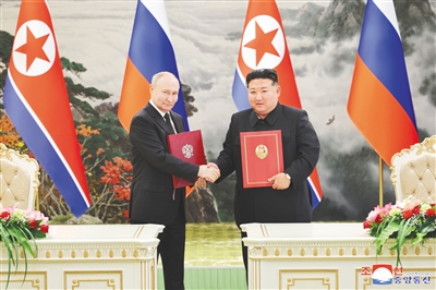 朝鲜劳动党总书记、国务委员长金正恩与俄罗斯总统普京19日在平壤签署《全面战略伙伴关系条约》。图为金正恩与普京在签约仪式上握手。新华社/朝中社