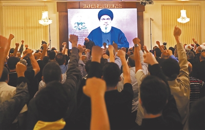 6月19日,在黎巴嫩首都贝鲁特,黎巴嫩真主党领导人纳斯鲁拉发表电视讲话。新华社发