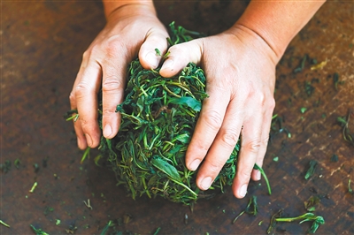 在五指山市水满乡,黎族村民手工制作大叶种茶。
