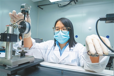 6月20日,位于定安塔岭工业园的海南百迈科医疗科技股份有限公司,工作人员操作医用缝合线线径测试仪对产品进行测试。本报记者 袁琛 摄