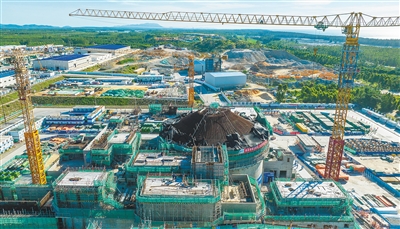 日前,俯瞰位于昌江的海南核电基地“玲龙一号”全球首堆施工现场。当前,“玲龙一号”项目进入安装高峰阶段。