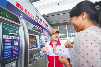 ■ 本报记者 周月光6月22日下午,高铁三亚站自动售票机前,身穿“博爱三亚”标志服装的志愿者张海艳来回走动,看到旅客购票取票,她都主动上前帮忙,4个小时帮助旅客操作购买60多张高铁票。