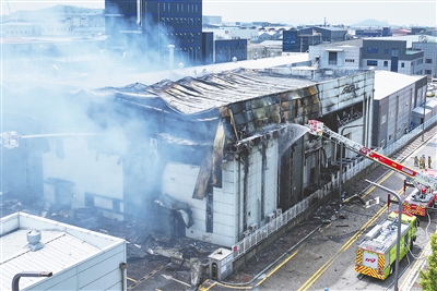 6月24日,消防员在韩国京畿道华城市的电池工厂火灾现场灭火。 新华社/美联