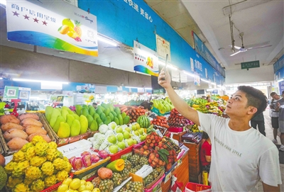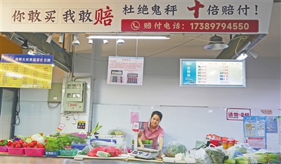 ③6月24日,海口新埠岛海鲜大世界,所有铺面上方的广告牌上醒目标写着“杜绝鬼秤 十倍赔付”等字样。
