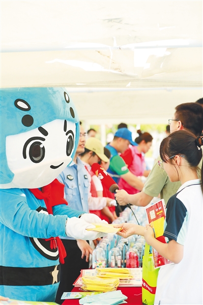 6月22日,海口市举办首届“禁毒杯”排球赛,现场工作人员身穿海口市禁毒卡通形象“蓝鲸”玩偶服和群众互动,宣传禁毒知识。