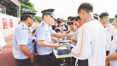 禁毒民警向学生发放禁毒知识手册。(图片均由定安县禁毒委提供)