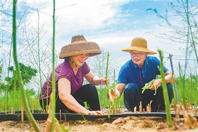 日前,在三亚市崖州区临高村,“博士村长”易克贤(右)帮助农户种植芦笋。 本报记者 王程龙 摄