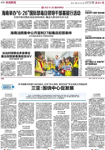6月25日,省委、省政府、省禁毒委相关领导在海口市琼山区、龙华区、秀英区调研禁毒工作,参观有关禁毒宣教活动,并看望慰问一线禁毒工作人员。各市县党政主要领导深入基层调研禁毒工作,20个省禁毒委成员单位的相关负责人分别赴各市县出席有关禁毒活动。