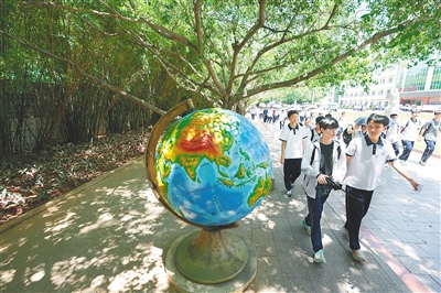 昌江中学学生走在明亮的校园里。