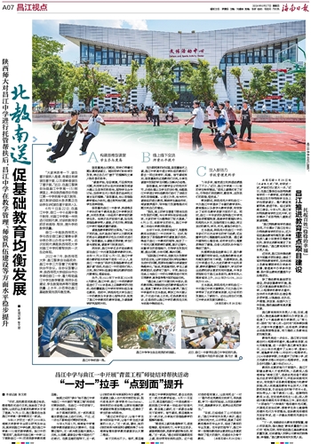 2022年7月,陕西师范大学、昌江黎族自治县政府、昌江中学三方签署了托管帮扶合作协议。自协议签署以来,陕西师范大学组织合作办学单位曲江一中,着力帮助昌江中学在教学管理、师资队伍建设、学生教育培养等方面提质量、上水平,示范带动昌江基础教育优质均衡发展。