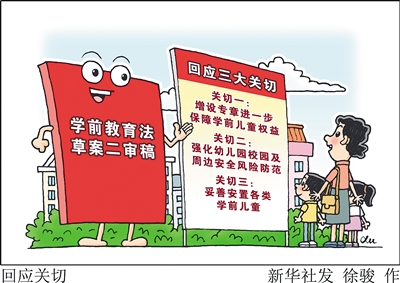 在新增的一章中,草案二审稿明确,学前儿童享有生命安全和身心健康、得到尊重和保护照料、依法平等接受学前教育等权利。地方各级人民政府应当采取措施,促进适龄儿童在父母或者其他监护人工作或者居住地方便就近接受学前教育。