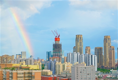 据了解,该项目由一栋94层总高度428米主塔楼和两座配楼组成,总建筑面积39万平方米,建成后将成为海南“第一高楼”。目前,塔楼核心筒已施工至50层,项目建设高度至217.6米,工程建设进度过半,预计2026年底初步具备竣工验收条件。